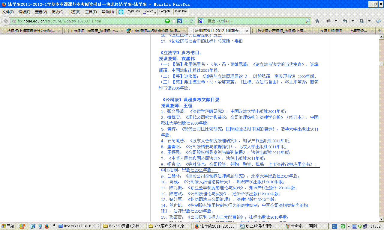 杨春宝高级律师主编的《完胜资本:公司投资、并购、融资、私募、上市法律政策应用全书》入选湖北经济学院法学院2011-2012第一学期《公司法》专业课课外参考阅读书目。
